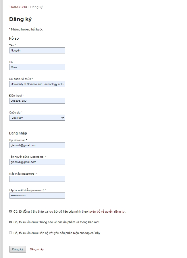 Người dùng sẽ được tự động đăng ký làm Bạn đọc và Tác giả. Ngoài ra người dùng cũng sẽ được cung cấp tùy chọn để đăng ký làm Người phản biện giúp tạp chí.